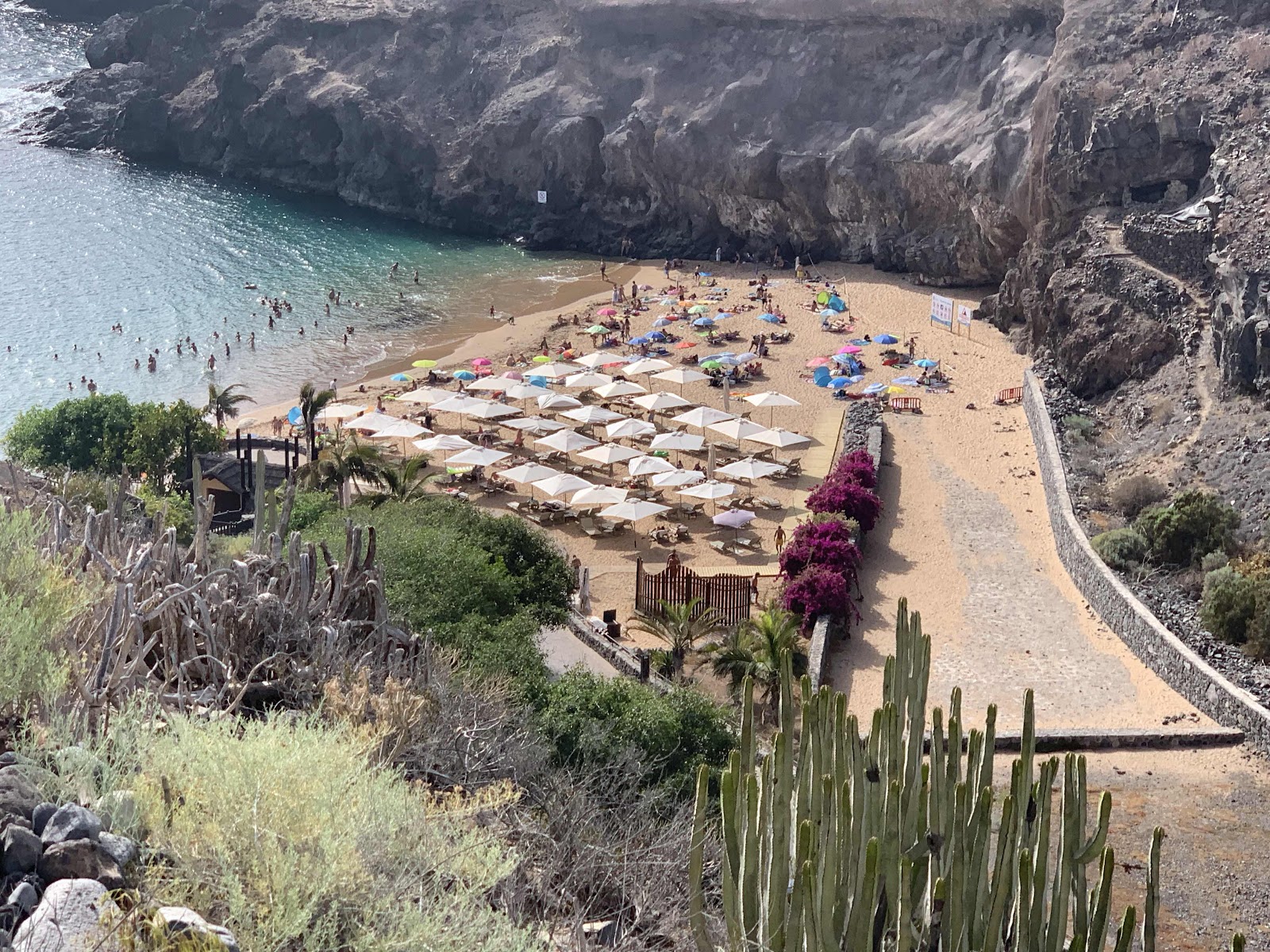Hola de nuevo. Hoy hemos empezado por la playa del hotel, pero ha sido un infierno bajar a ella. Aquí en el hotel hay unas furgonetas que pasan cada 20 minutos que te dejan en la playa, pero es festivo y hay mucha gente. Hemos conseguido hamaca y sombrilla de casualidad.